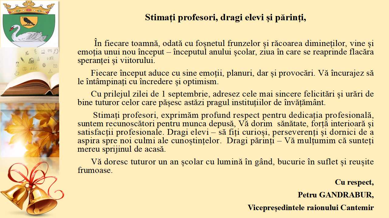 Prima Noutăţi Mesaj de felicitare al vicepreședintelui raionului Cantemir dl Petru Gandrabur, cu prilejul...NoutăţiMesaj de felicitare al vicepreședintelui raionului Cantemir dl Petru Gandrabur, cu prilejul începerii anului școlar 2025-2026. 01.09.2025151 🔊 Facebook Twitter OK Linkedin Viber WhatsApp ImprimareARTICOLE SIMILAREDE LA ACELAȘI AUTORRezultate de excepție obținute de Clubul „New Dance” la competiția internațională „Codreanca 2026”Atelier de instruire privind securitatea cibernetică desfășurat la Cantemir: pași spre un mediu digital mai sigurȘedința extraordinară a Consiliului Raional Cantemir din 28 aprilie 2026Ultimele articoleRezultate de excepție obținute de Clubul „New Dance” la competiția internațională „Codreanca 2026” 29.04.2026Atelier de instruire privind securitatea cibernetică desfășurat la Cantemir: pași spre un mediu digital mai sigur 29.04.2026Ședința extraordinară a Consiliului Raional Cantemir din 28 aprilie 2026 29.04.2026Ședințe ale comisiilor consultative de specialitate organizate la data de 27.04.2026 pentru ședința extraordinară a Consiliului Raional Cantemir din 28.04.2026 27.04.2026Cea de-a VI-a ediție a Festivalului cântecului popular pascal „Cântați Lumina Domnului”, desfășurat în satul Cîrpești 27.04.2026