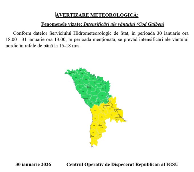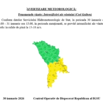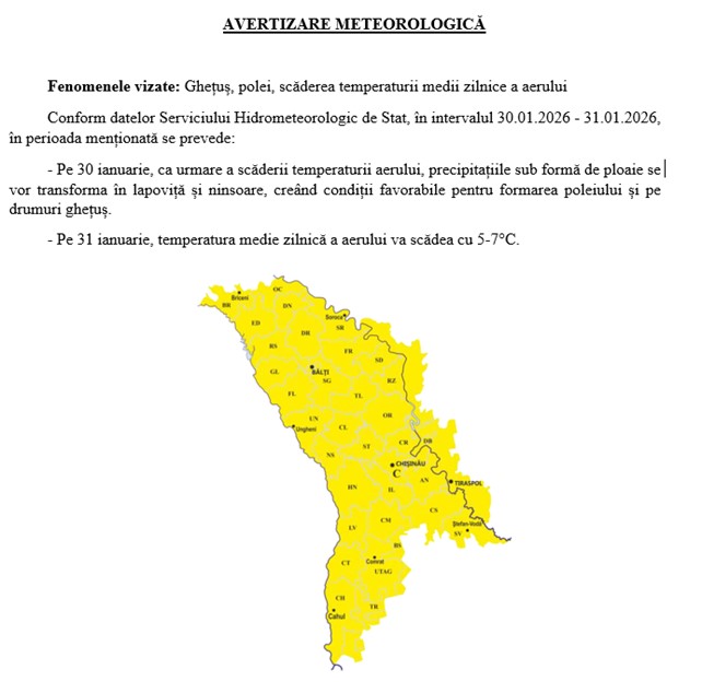 Potrivit Serviciului Hidrometeorologic de Stat, în perioada 30 ianuarie – 2 februarie, pe întreg teritoriul Republicii Moldova se vor menține condiții meteorologice nefavorabile, caracterizate prin lapoviță și ninsoare, precum și risc sporit de formare a poleiului și ghețușului pe drumuri. Temperatura aerului va înregistra o scădere treptată în intervalul 31 ianuarie – 2 februarie, în special pe timp de noapte, fapt ce poate determina înrăutățirea condițiilor de trafic, reducerea vizibilității și creșterea riscurilor pentru siguranța cetățenilor.