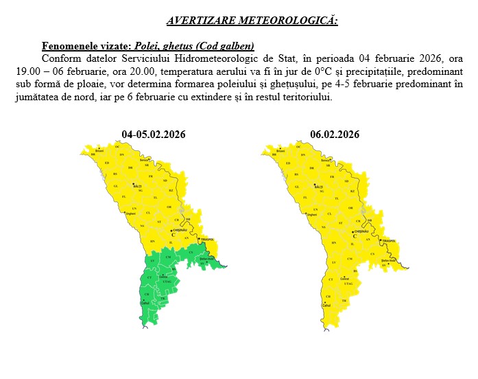 Potrivit Serviciului Hidrometeorologic de Stat, în perioada 4 februarie 2026, ora 19:00 – 6 februarie 2026, ora 20:00, conform Serviciului Hidrometeorologic de Stat, sunt prognozate temperaturi în jur de 0°C și precipitații sub formă de ploaie, favorabile producerii poleiului și ghețușului. Fenomenele vor fi mai pronunțate în jumătatea de nord a țării în zilele de 4–5 februarie, urmând ca pe 6 februarie să se extindă pe întreg teritoriul.