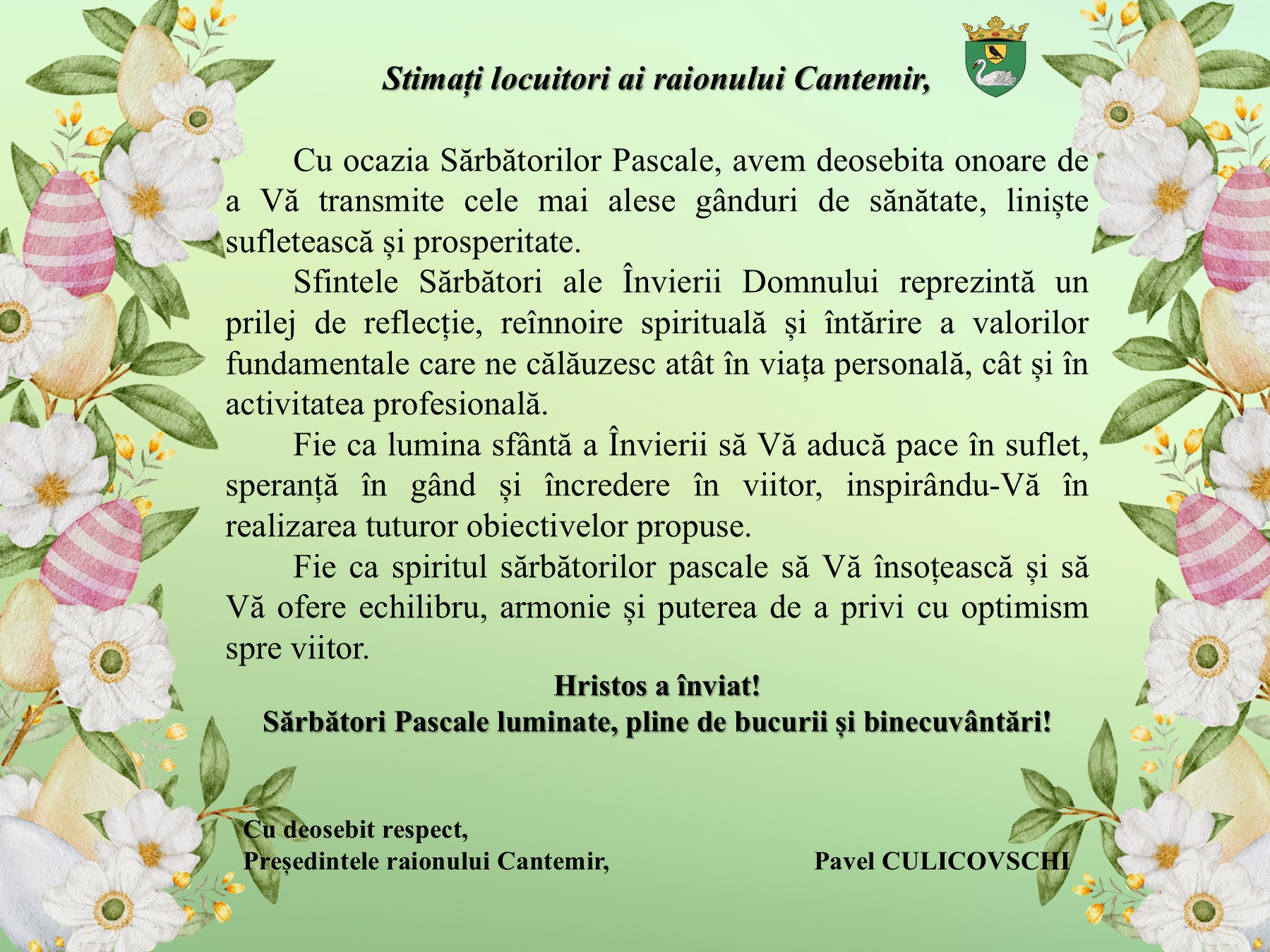 Prima Noutăţi Mesaj de felicitare al dlui Pavel CULICOVSCHI, președintele raionului, cu prilejul Sfintelor...NoutăţiMesaj de felicitare al dlui Pavel CULICOVSCHI, președintele raionului, cu prilejul Sfintelor Sărbători Pascale 12.04.202630 🔊 Facebook Twitter OK Linkedin Viber WhatsApp ImprimareARTICOLE SIMILAREDE LA ACELAȘI AUTORCociulia – satul unde legenda prinde viață și drumeția începeFestivalul Internațional de Datini și Obiceiuri de Primăvară – Ediția a XXVIII-a desfășurat în satul Cîșlița-Prut, raionul CahulMesaj de felicitare al dlui Pavel CULICOVSCHI, președintele raionului, cu prilejul Zilei Salvatorului și PompierilorUltimele articoleMesaj de felicitare al dlui Pavel CULICOVSCHI, președintele raionului, cu prilejul Sfintelor Sărbători Pascale 12.04.2026Cociulia – satul unde legenda prinde viață și drumeția începe 09.04.2026Festivalul Internațional de Datini și Obiceiuri de Primăvară – Ediția a XXVIII-a desfășurat în satul Cîșlița-Prut, raionul Cahul 09.04.2026Mesaj de felicitare al dlui Pavel CULICOVSCHI, președintele raionului, cu prilejul Zilei Salvatorului și Pompierilor 05.04.2026Dialog pentru dezvoltare economică la Cantemir: întâlnire cu Camera de Comerț și Industrie a Republicii Moldova, filiala Cahul 03.04.2026
